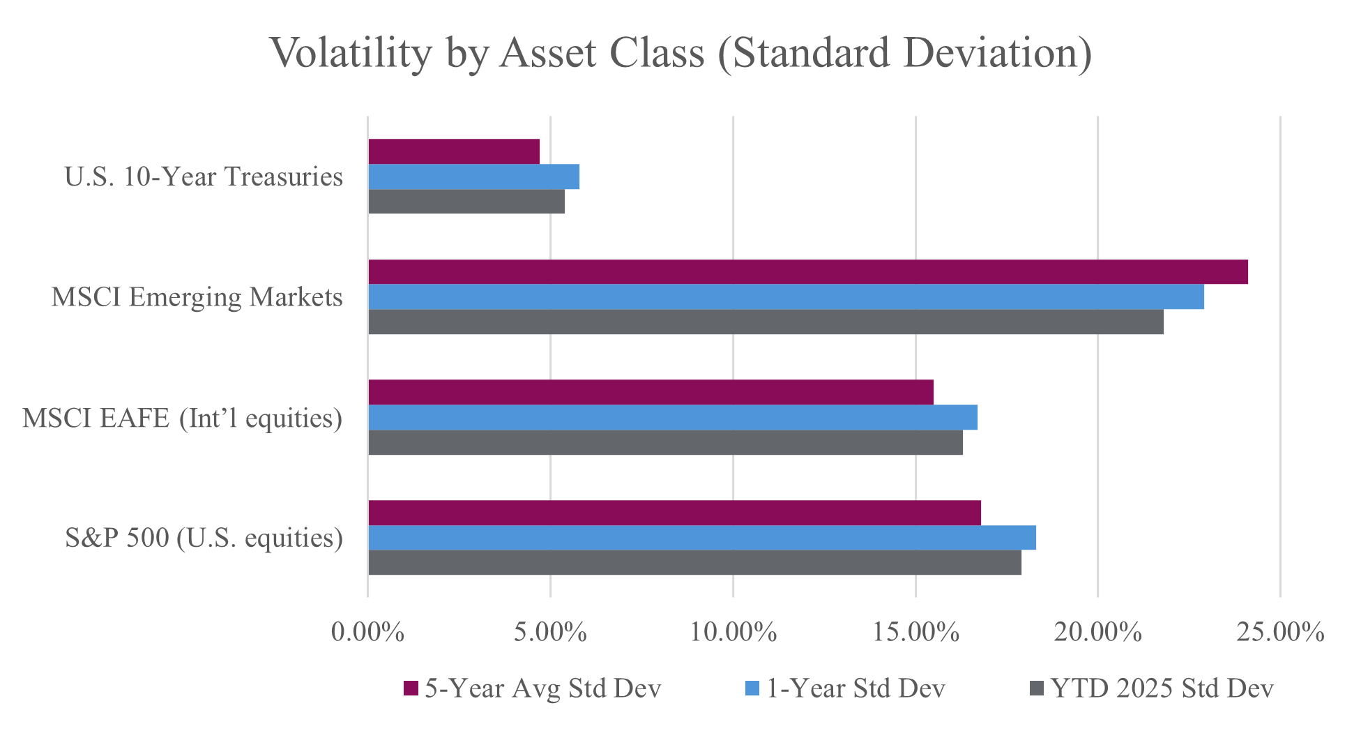 Emerging markets continue to show the highest volatility, reflecting higher political and economic uncertainty. U.S. Treasuries remain a stabilizing force, offering relatively low volatility.