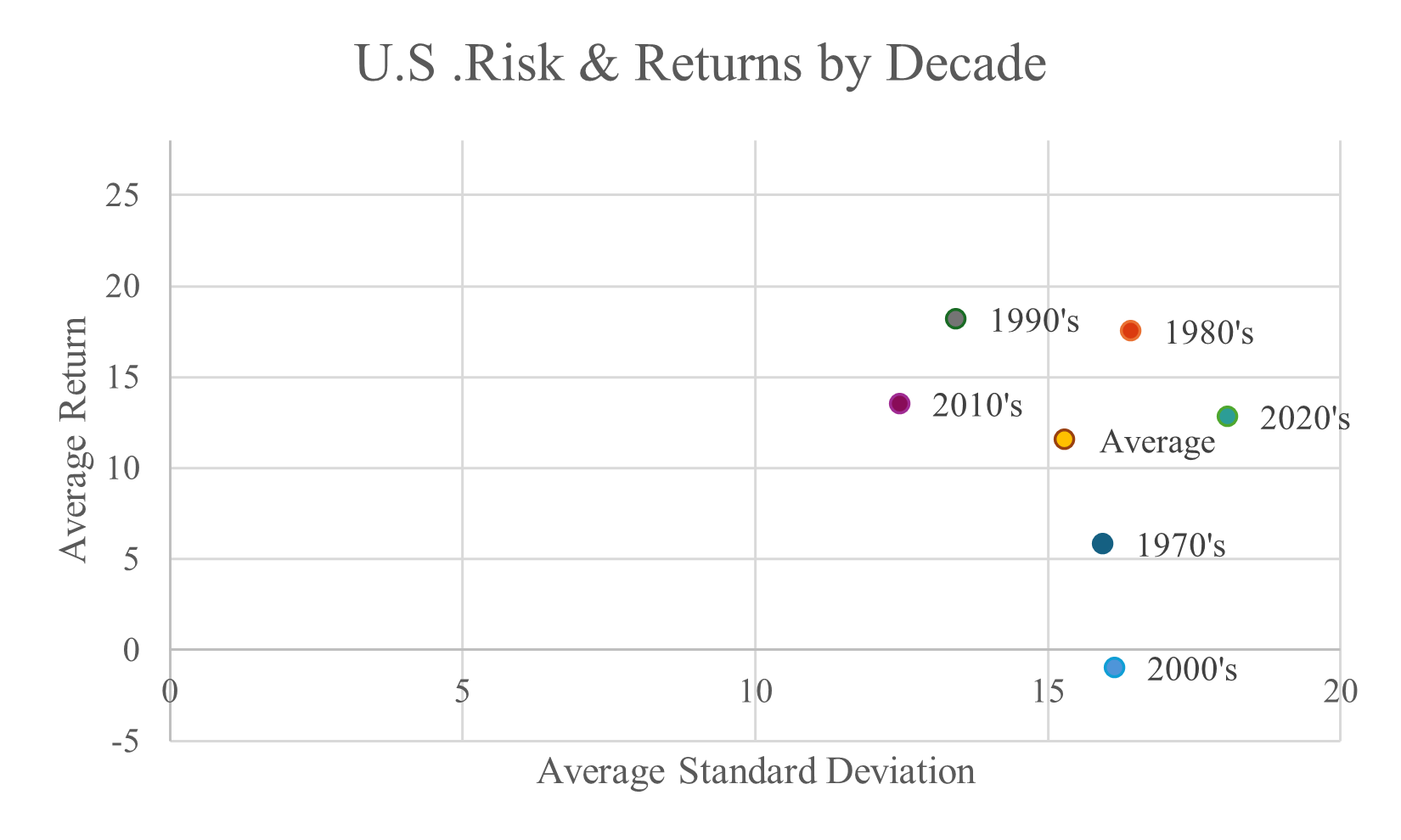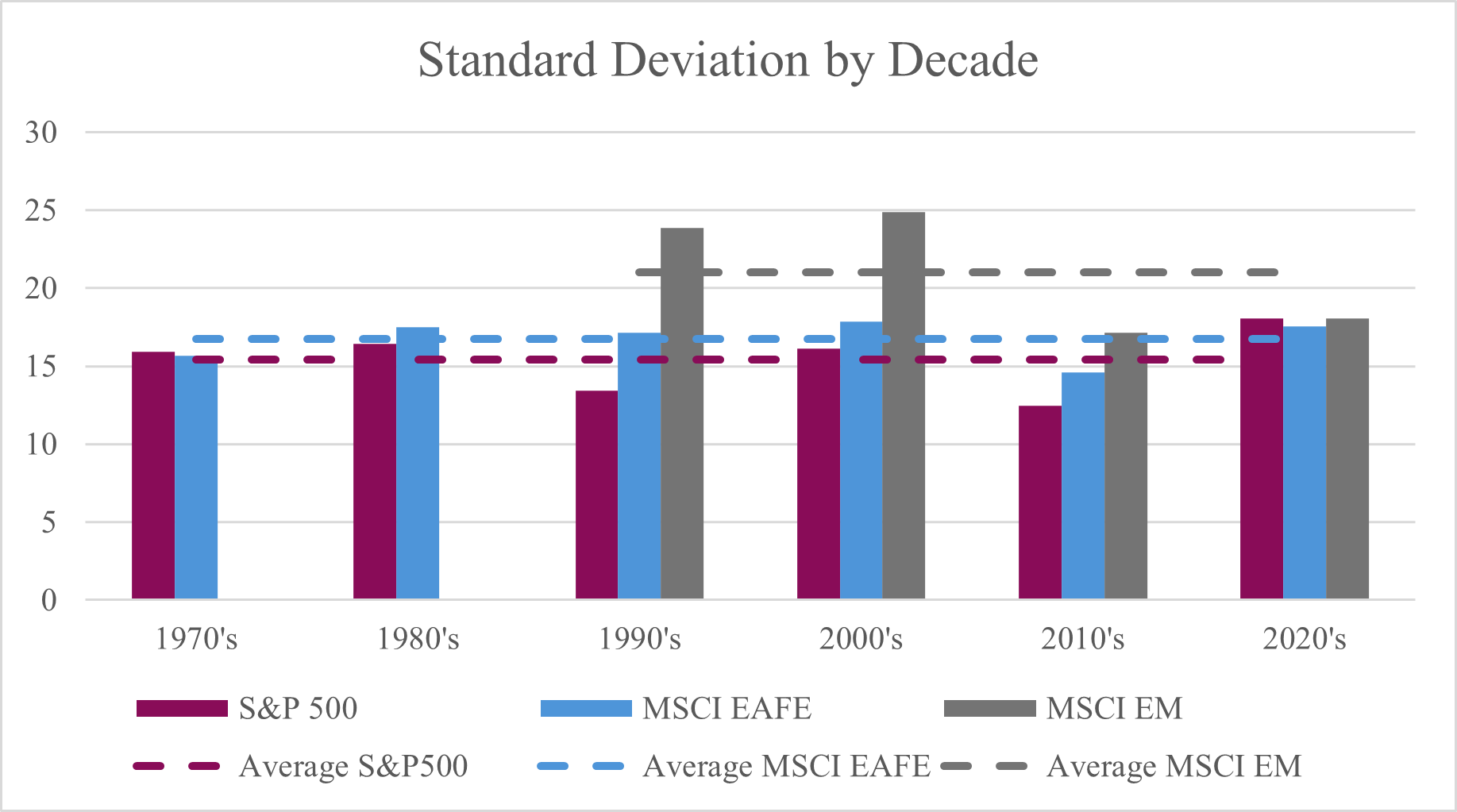 However, the low volatility and high returns of the 2010’s may have lulled U.S. investors into a false sense of security. Despite the higher standard deviation for the first few years of the current decade, returns are still above average. Higher volatility does not equal lower returns.